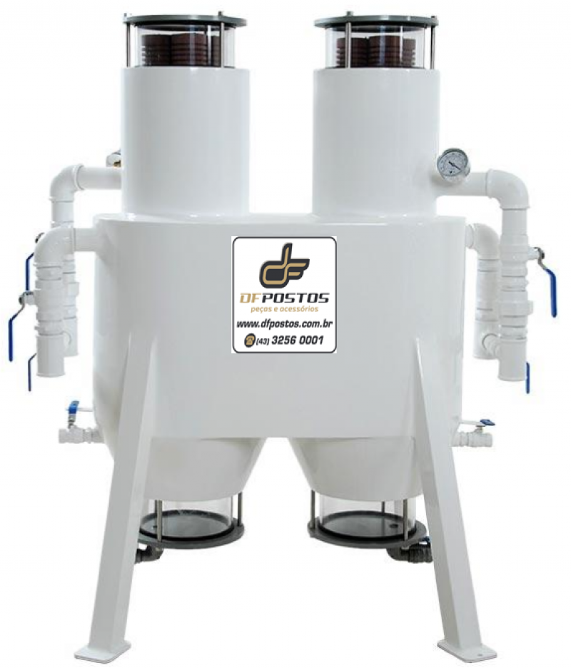 Filtro desidratador para diesel ou biodiesel com alta eficiência de filtragem de sólidos e separação de agua, desenvolvido para postos revendedores de combustíveis e abastecimentos próprios, devendo ser instalado junto a 01 bomba de sucção dupla ou 02 bombas simples ou duais. Composto por corpo em aço carbono, visores de policarbonato de alta resistência, entrada e saída de 1 ½”, elementos de celulose e resina fenolica com varição de filtragem de 1 a 150 microns, tampas em aço carbono, sistema “by-pass” para desvio momentâneo de fluxo, dreno na parte inferior e vacuômetro para indicar saturação dos elementos filtrantes.